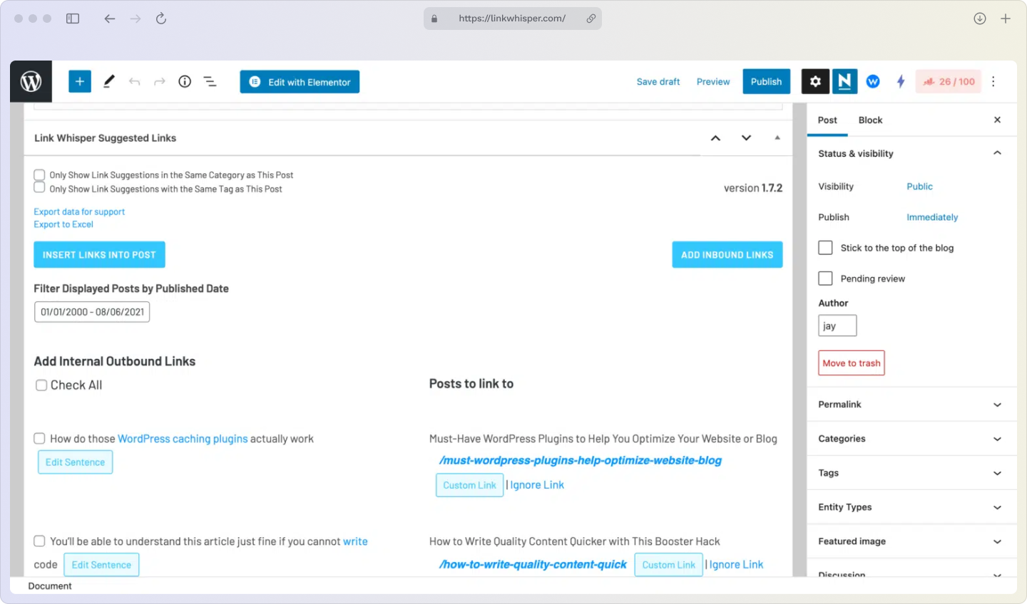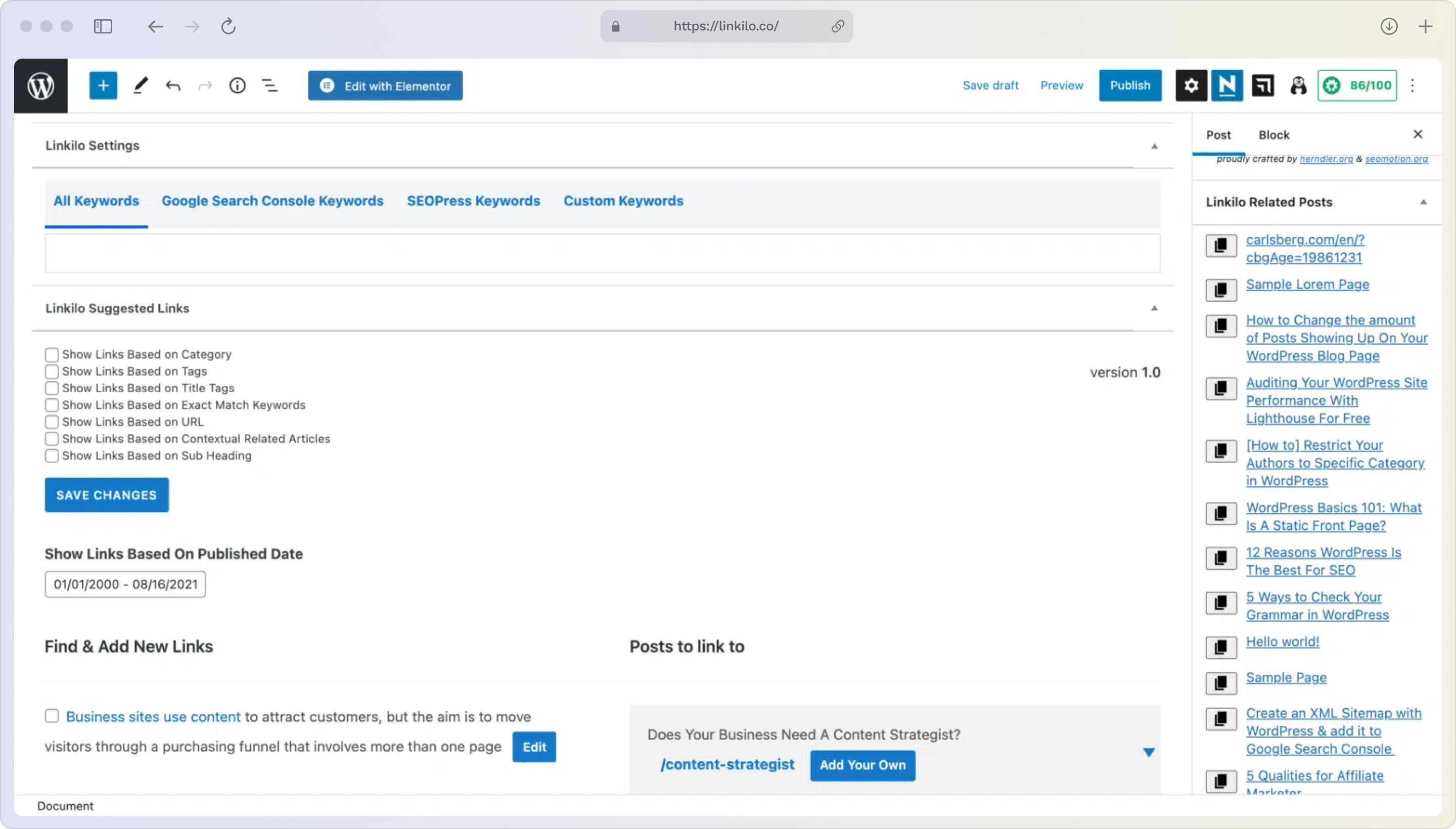 Plus, we’ve made the entire process more convenient with our innovative sidebar link suggestions. As you write or edit your articles, Linkilo contextually identifies relevant articles on your site and displays suggestions in the sidebar—no need to scroll or disrupt your workflow.